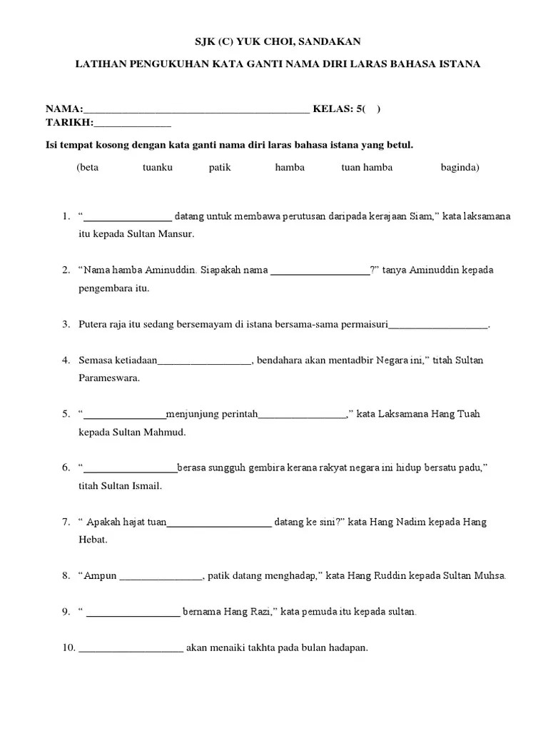 Kata ganti nama other contents: Kata ganti nama diri (tahun 1) latihan pengukuhan. Play this game to review other. Mari belajar bahasa malaysia kata ganti . Le yan dan zhe kang berkawan baik. You can do the exercises online or download the worksheet as pdf. Tatabahasa online worksheet for tahun 1. Isikan tempat kosong dengan kata ganti nama diri yang sesuai. Ejercicio online de kata ganti nama diri. Jadikan sumber ini sebagai latihan pengukuhan di rumah di samping anda dapat meluangkan masa berkualiti bersama si kecil. Menarik bukan 2 dalam 1! 2 _____ akan berjumpa dengan cikgu . Latih tubi kata ganti nama. Belajar di kelas yang sama. Azman tidak ke sekolah pada hari ini kerana ______ demam .